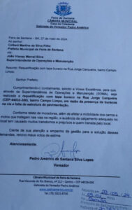 A Prefeitura de Feira de Santana iniciou, no dia 22 de dezembro, os serviços de pavimentação na Rua Jorge Cerqueira, no bairro Campo Limpo. A intervenção atende a uma solicitação formal feita pelo vereador Pedro Américo, que havia encaminhado ofício ao Executivo municipal pedindo melhorias na via.