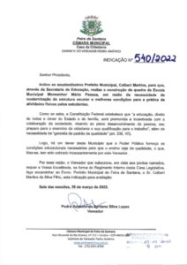O vereador Pedro Américo faz indicação da construção de quadra na Escola Municipal Monsenhor Mário Pessoa, no bairro Cidade Nova.