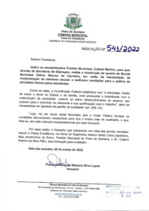 O vereador Pedro Américo faz indicação para construção de quadra na Escola Municipal Otávio Mansur de Carvalho, no bairro São João.