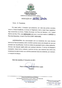 Pedro Américo através da indicação 1198/2021 solicitou a realização de limpeza da rua dos Guaranis, no bairro Rua Nova, devido a presença ao acúmulo de lixo e mau cheiro no local.