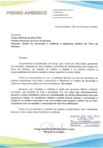 Vereador Pedro Américo cobra novamente ao prefeito Colbert Martins Filho, uma resposta ao manifesto em defesa da prevenção a violência e segurança pública em Feira de Santana.
