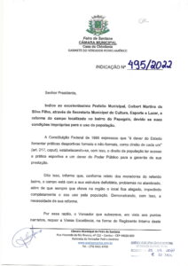 Segundo relatos dos moradores do bairro o campo está com sua estrutura deficitária, problemas no alambrado e sempre quando chove na região o local fica alagado, com isso o vereador Pedro Américo faz indicação ao prefeito Colbert para realizar a reforma do campo.
