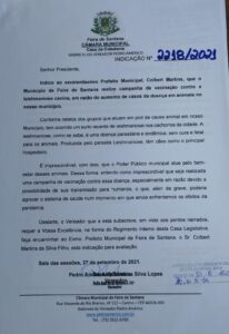 Pedro Américo indica ao Município que realize campanha de vacinação contra a leishmaniose canina
