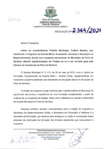Através da indicação nº2364/2021, Vereador Pedro Américo solicitou que o Prefeito Colbert Martins transforme o programa guarda mirim em um programa permanente do Município de Feira de Santana, através da regulamentação em projeto de lei.