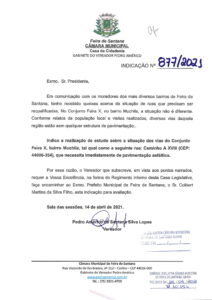 As vias do Conjunto Feira X necessitam imediatamente de pavimentação asfáltica, com isso, Vereador Pedro Américo fez indicação 877/2021 ao prefeito Colbert Martins, para que seja realizado um estudo sobre a situação das vias do bairro.