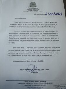 Pedro Américo indica instalação de câmeras de videomonitoramento em Tiquaruçu