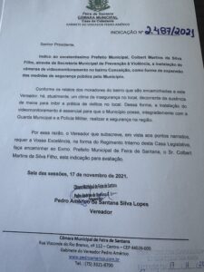 Pedro Américo indica instalação de câmeras de videomonitoramento no bairro Conceição