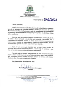 Mediante a necessidade e melhores condições para atividades físicas dos alunos da Escola Municipal Comendador Jonathas Telles de Carvalho, bairro Conceição, Pedro Américo fez a indicação 545/2022 para o prefeito Colbert Martins, solicitando a reforma da quadra poliesportiva da escola.
