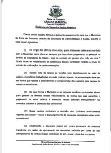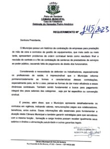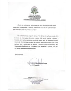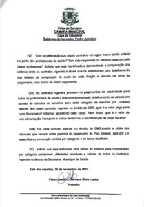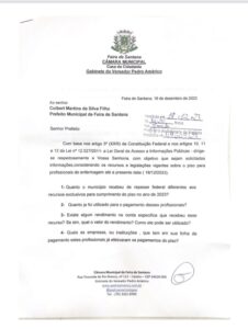 Nos documentos, Pedro Américo questiona ao prefeito: Quanto o município recebeu de repasse federal diferentes aos recursos exclusivos para cumprimento do piso no a n ode 2023? Quanto ja foi utilizado para o pagamento desses profissionais? Existe algum rendimento na conta especifica que recebeu esse recurso? Se sim, qual o valor do rendimento? Como ele pode ser utilizado? Quais as empresas, ou instituições, que tem em sua folha de pagamento estes profissionais já efetivaram os pagamentos do piso? Quais as justificativas adminitsrativas para não regularização deste pagamento mensalmente a todos os profissionais ? Quais as acões tomadas