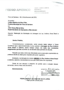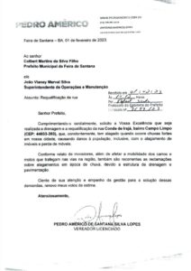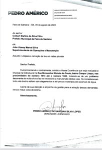Pedro Américo tem protocolado diversos ofícios e solicitações para que com urgência seja realizada a drenagem urbana e recapeamento asfáltico de diversas vias do Campo Limpo.