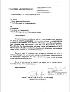 A drenagem é ferrenhamente defendida pelo parlamentar que está sempre sensível às solicitações da população e compreende que para que Feira de Santana torne-se a cidade Metrópole que merece, precisa resolver problemas básicos como o da drenagem pluvial, garantindo maior segurança habitacional para os moradores.