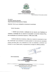 Vereador Pedro Américo através de oficio feito para a Prefeitura Municipal de Feira de Santana, solicitou a instalação de um redutor de velocidade na avenida Artêmia Pires, no bairro SIM.