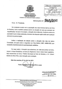 Foi feita indicação 865/2021 ao prefeito Colbert Martins solicitando a pavimentação asfáltica da rua Belém no bairro Conceição.