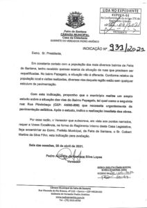 Feita indicação 931/2021 ao prefeito Colbert Martins solicitando a requalificação com pavimentação asfáltica da rua Pindobaçu no bairro Papagaio.