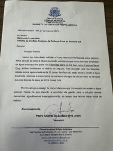 Pedro Américo solicita ampliação de água encanada nas fazendas Maria de Sá e Santa Cruz