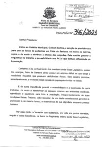 Através de ofício Pedro Américo solicita ao prefeito Colbert Martins a adoção de providências para que as faixas de pedestres em Feira de Santana sejam de modo a elevá-las a alturas das calçadas, garantindo assim a segurança no trânsito e acessibilidade aos PCDs que tenham dificuldade de locomoção.