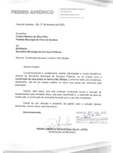 Pedro Américo solicita construção de uma praça no Vila Olímpia