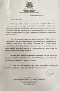 Pedro Américo solicita informações sobre o atendimento do transporte público em cada bairro, Sub-bairro e distritos de Feira de Santana