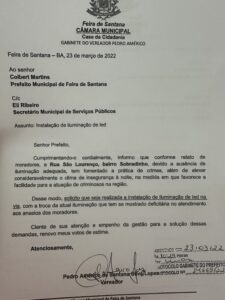 Pedro Américo solicita instalação de iluminação de LED na rua São Lourenço