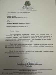 Pedro Américo solicita instalação de iluminação LED na rua rio Tocantins