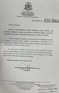 Pedro Américo solicita instalação e reparo dos postes de iluminação na Rua Boa Esperança