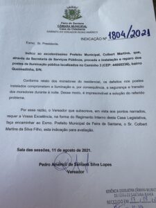 Pedro Américo solicita instalação e reparo no Caminho 3