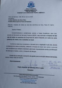 Pedro Américo solicita limpeza de todas as vias dos caminhos no Conjunto Feira IV