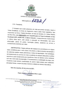 A indicação 1282/2021 sendo direcionada ao prefeito Colbert Martins solicitando atenção na praça localizada na rua Pau Brasil, no bairro Calumbi, que encontrava-se em estado precário e sem a devida manutenção, prejudicando os moradores locais.