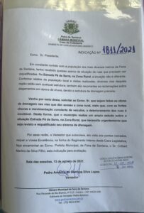 Pedro Américo solicita obras de drenagem nas vias que dão acesso a zona rural