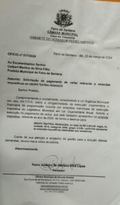 Pedro Américo solicita pagamento de verba impositivas ao Grupo Teatral Renascer