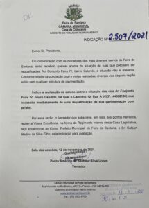 Pedro Américo solicita pavimentação asfáltica da Rua Ubirajara