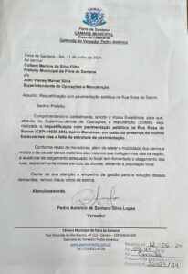 Pedro Américo solicita pavimentação asfáltica na Rua Rosa de Sarom