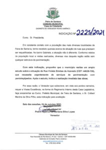 Foi feita indicação ao prefeito Colbert Martins solicitando amplo estudo sobre a situação da rua Violeta Simões de Azevedo, bairro Gabriela, que necessita de pavimentação com paralelepípedos.