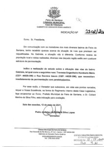 Através da indicação 1102/2021, o vereador Pedro Américo solicita ao prefeito Colbert Martins, para que seja realizado um estudo sobre a situação das vias do bairro Gabriela, como as seguintes ruas: Travessa Engenheiro Humberto Mario e rua Escrava Isaura, que necessitam imediatamente de pavimentação com paralelepípedos.