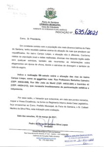 Vereador Pedro Américo fez a indicação 635/2021 ao Prefeito Colbert Martins sobre a realização de pavimentação asfáltica e calçamento nas ruas: Professora Bertolina Carneiro, São João do Meriti e caminho 41, no bairro Campo Limpo.