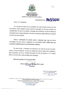 Com o objetivo de melhorar locomoção dos moradores, Pedro Américo fez indicação 865/2021 ao prefeito para que seja realizado um estudo sobre a situação das vias do bairro Conceição, logo solicita a pavimentação asfáltica na rua Belém.