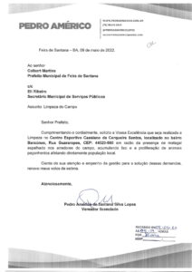 Em razão da presença do matagal espalhado nos arredores do campo, acumulando lixo e a proliferação de animais peçonhentos afetando diretamente a população local, Pedro Américo solicita limpeza no Centro Esportivo Cassiano de Cerqueira Santos, localizado no bairro Baraúnas.