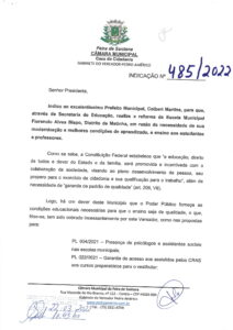Tendo em vista a melhoria de ensino do município, através da indicação 485/2022, Pedro Américo solicita ao prefeito Colbert Martins a reforma da Escola Municipal Florêncio Alves Bispo, que fica localizada no distrito de Matinha.