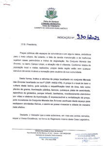 Vereador Pedro Américo solicita através de indicação de nº 930/2021, reforma da praça localizada no conjunto morada das árvores localizada na rua F. A praça é local de lazer e cultura deste bairro.