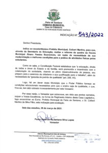 Com a indicação 543/2022 o Vereador solicitou a reforma da quadra, em razão da necessidade da modernização da estrutura escolar e melhores condições para a prática de atividades físicas dos estudantes da Escola Municipal Álvaro Pereira Boaventura, Distrito de Bonfim de Feira.