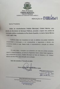 Pedro Américo solicita reparo dos postes de iluminação na Rua Santo Expedito
