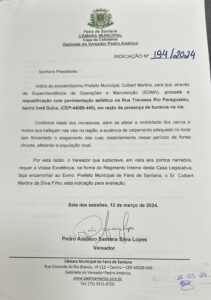 Pedro Américo solicita requalificação com pavimentação asfáltica na rua Travessa Rio Paraguassu
