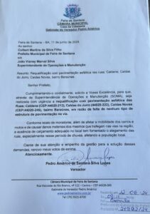 Pedro Américo solicita requalificação com pavimentação asfáltica nas ruas Caldene, Caldas do Jorro e Caldas Novas