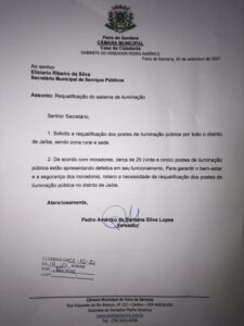 Pedro Américo solicita requalificação da iluminação na Jaíba