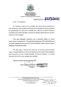 Foi feita indicação ao prefeito Colbert Martins solicitando atendimento a população da 1ª Travessa Boa Esperança, situada no bairro CIS, com a requalificação das vias daquela localidade.