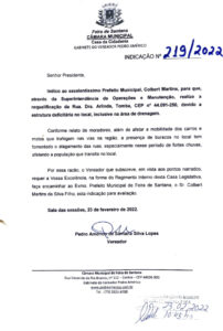 Através de uma indicação, o vereador Pedro Américo solicita ao prefeito Colbert Martins a requalificação da Rua. Dra. Arlinda, Tomba, devido a presença de buracos nas vias.