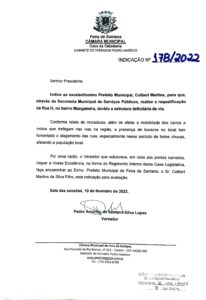 Através de uma indicação, o vereador Pedro Américo solicita ao prefeito Colbert Martins a requalificação da Rua H, no bairro Mangabeira, devido a presença de buracos nas vias.