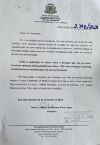 Pedro Américo solicita requalificação de pavimentação na Rua General Costa e Silva