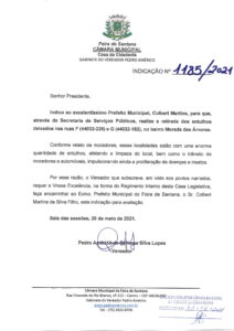 Pensando no bem estar da localidade Morada das árvores, o vereador Pedro Américo, solicitou que o poder público retirasse os entulhos na Rua F e G, no bairro Morada das árvores. Essa indicação veio dos relatos dos moradores que reclamavam de entulhos no local.