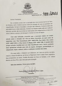Pedro Américo solicita serviços de drenagem e pavimentação na Rua Carmo de Minas